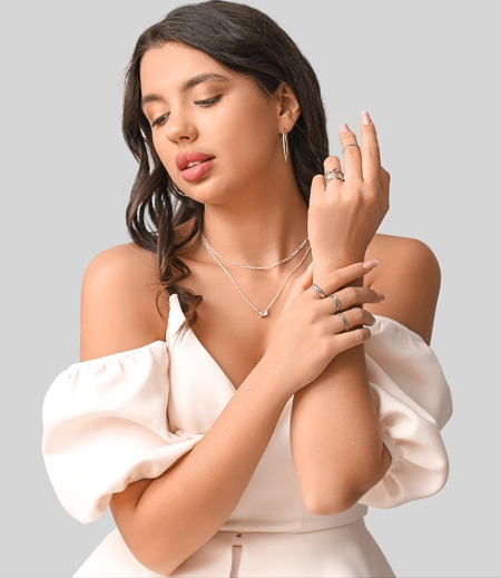 Les colliers délicats et bagues minimalistes apportent une touche de lumière discrète. L’association de plusieurs chaînes de longueurs variées crée une dynamique moderne sur un décolleté sobre.